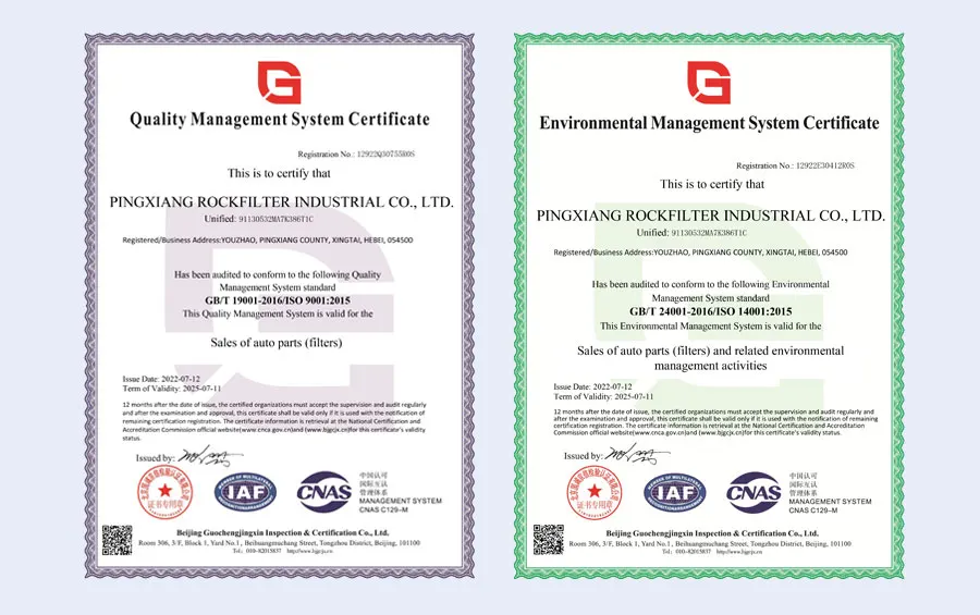 PINGXIANG ROCKFILTER INDUSTRIAL CO., LTD. is a professional manufacturer and supplier of Heavy Duty and Light Duty Air Filters, Passenger Car Air Filters, Cabin Filters, Oil Filter, Fuel Filter, Hydraulic Filter, Air Drier, Filter Base, Engine Breather Filter et cetera, founded in 2007 locate at Hebei, China. Our skilled workers amount to 30 with 10 years’ rich producing experiences, all the filters made following ISO9001 and ISO14001. As label for the stable quality and good performance, ROCKFIL is our registered trademark for the international market.